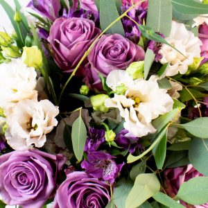 Ανθοδέσμη με τριαντάφυλλα, λυσίανθο, ευκάλυπτο και αλστρομέρια ύψους 40cm. και πλάτος 35cm.…